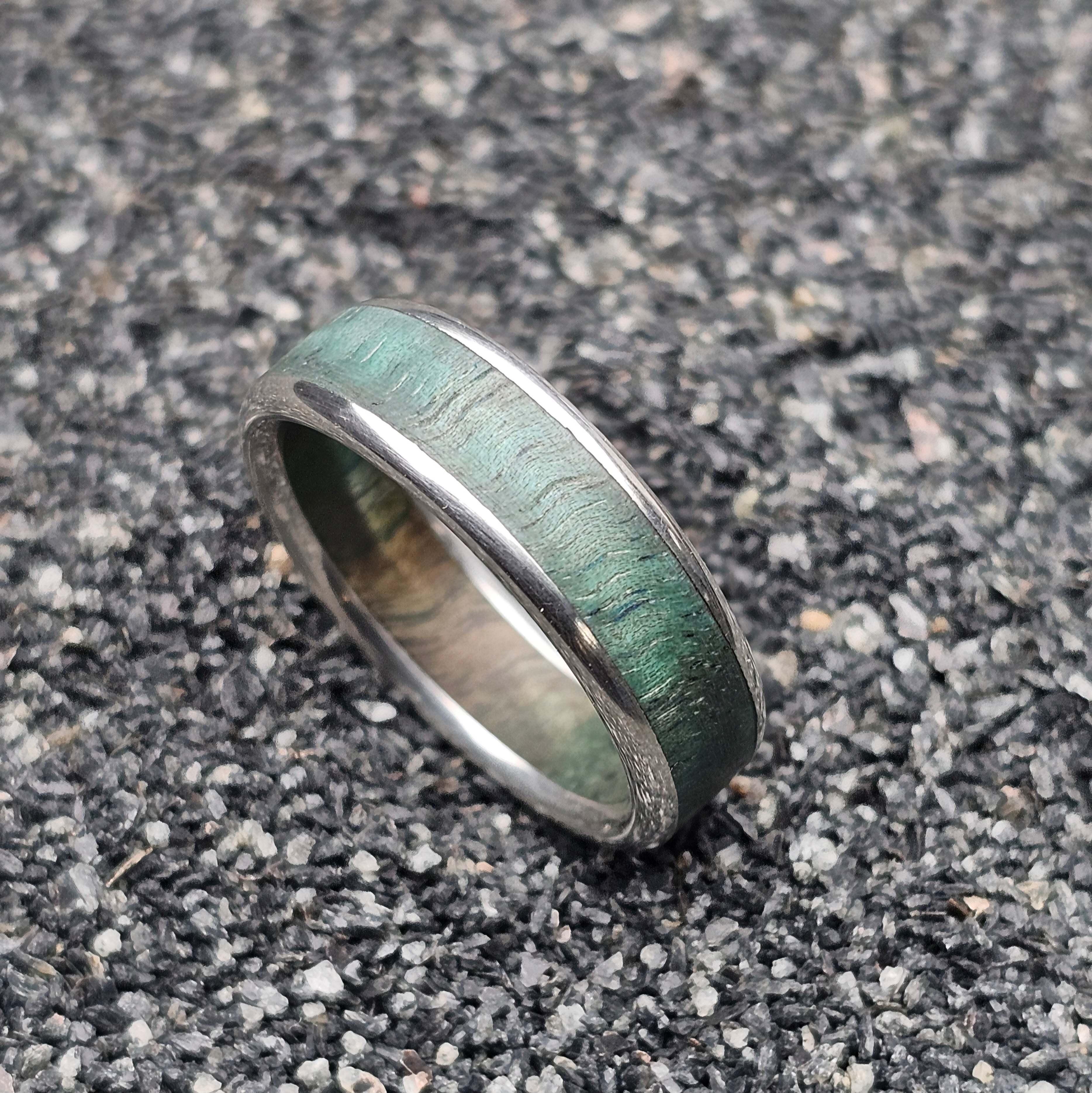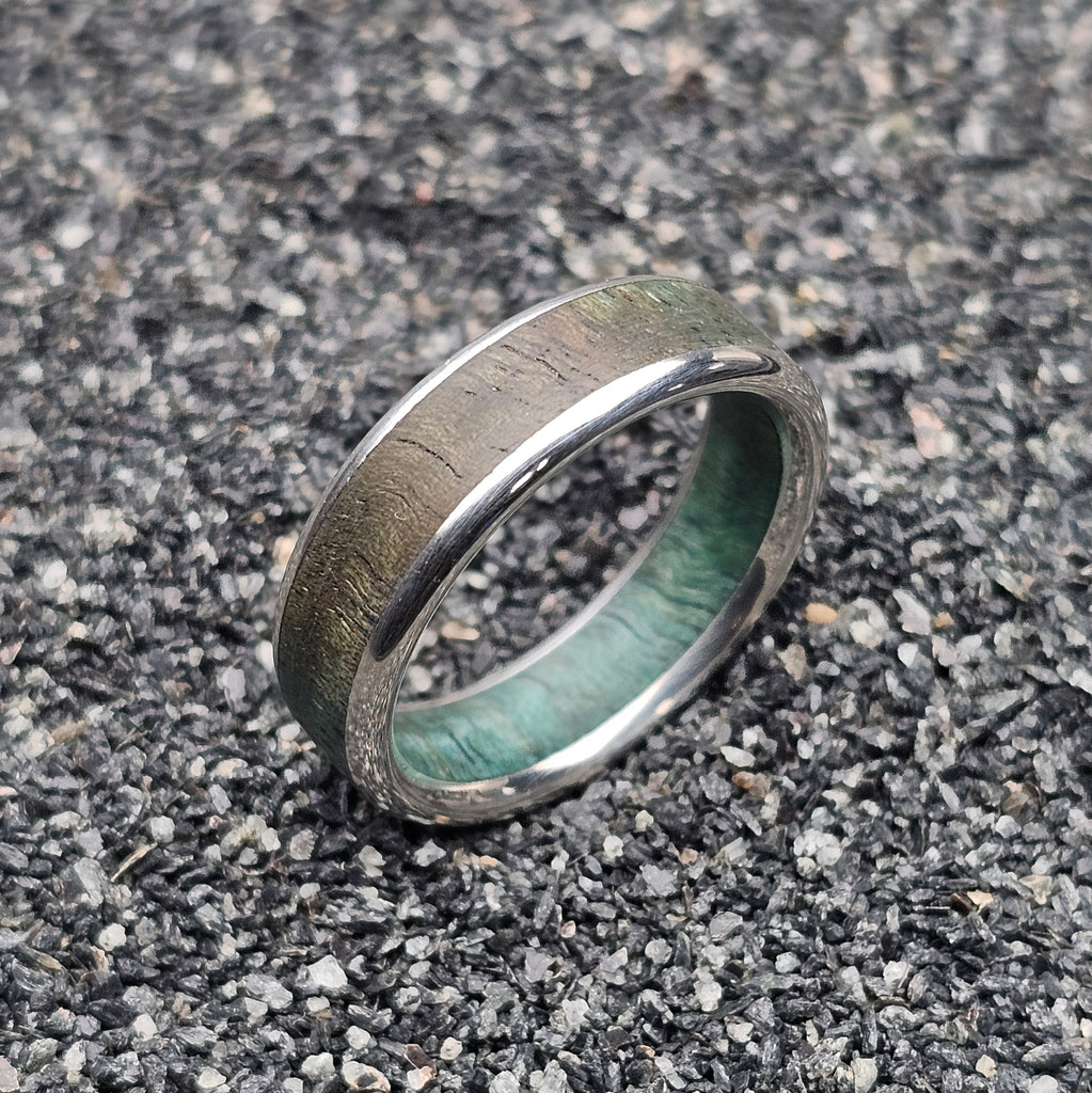 Handcrafted from green-teal Tasmanian Blackwood, this band features Continuum silver sides and silver rivets. A simple, refined design combining a touch of color and precise metalwork.