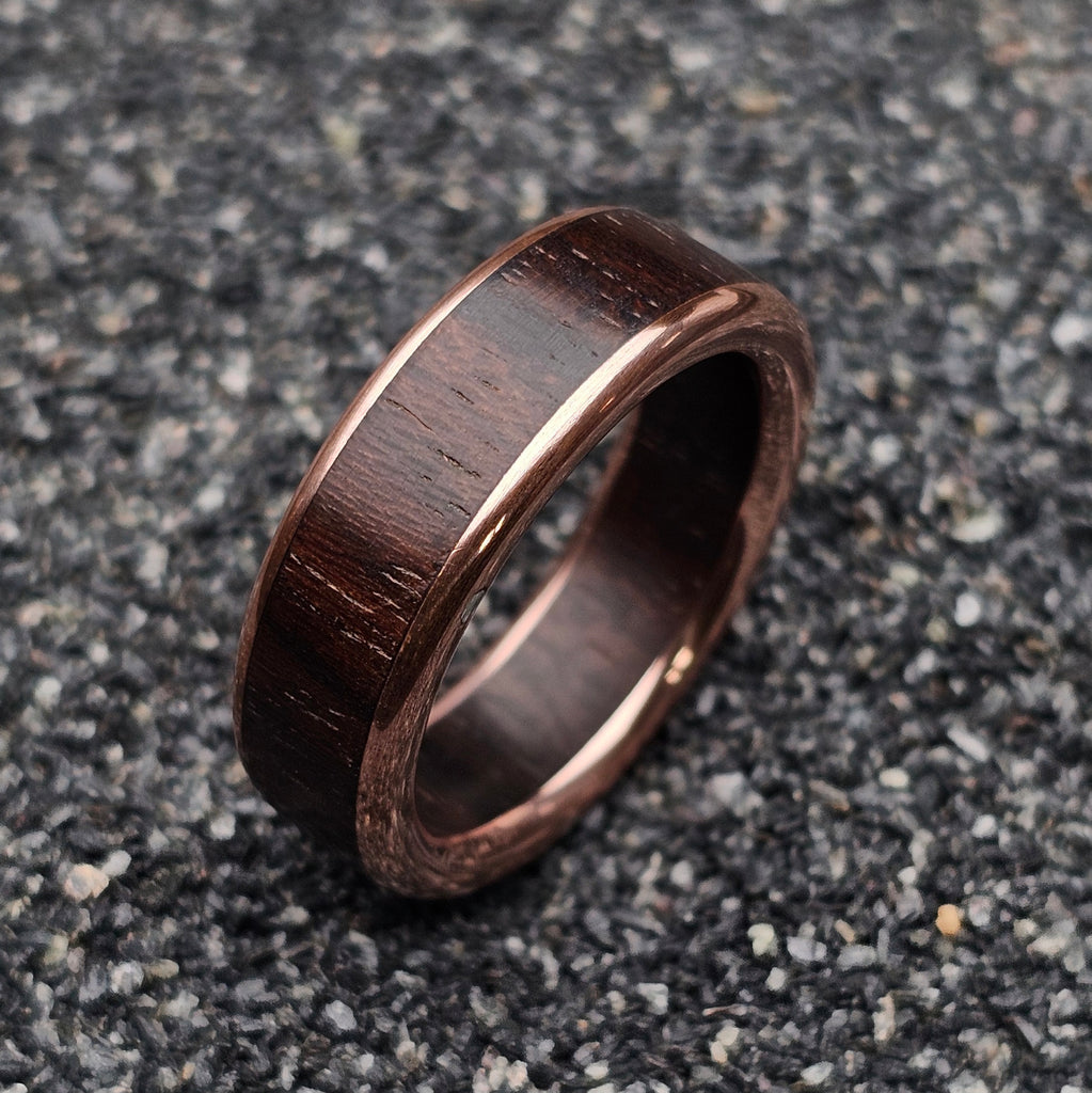 Introducing our Ziricote Wood Band, a celebration of exotic luxury and refined craftsmanship. This ring boasts the rich, dark hues and intricate grain patterns of ziricote wood, evoking a sense of mystery and depth. Framed by warm copper sides and detailed with sterling silver rivets, this band is a perfect blend of natural beauty and contemporary style. It's more than a ring; it's a work of art.