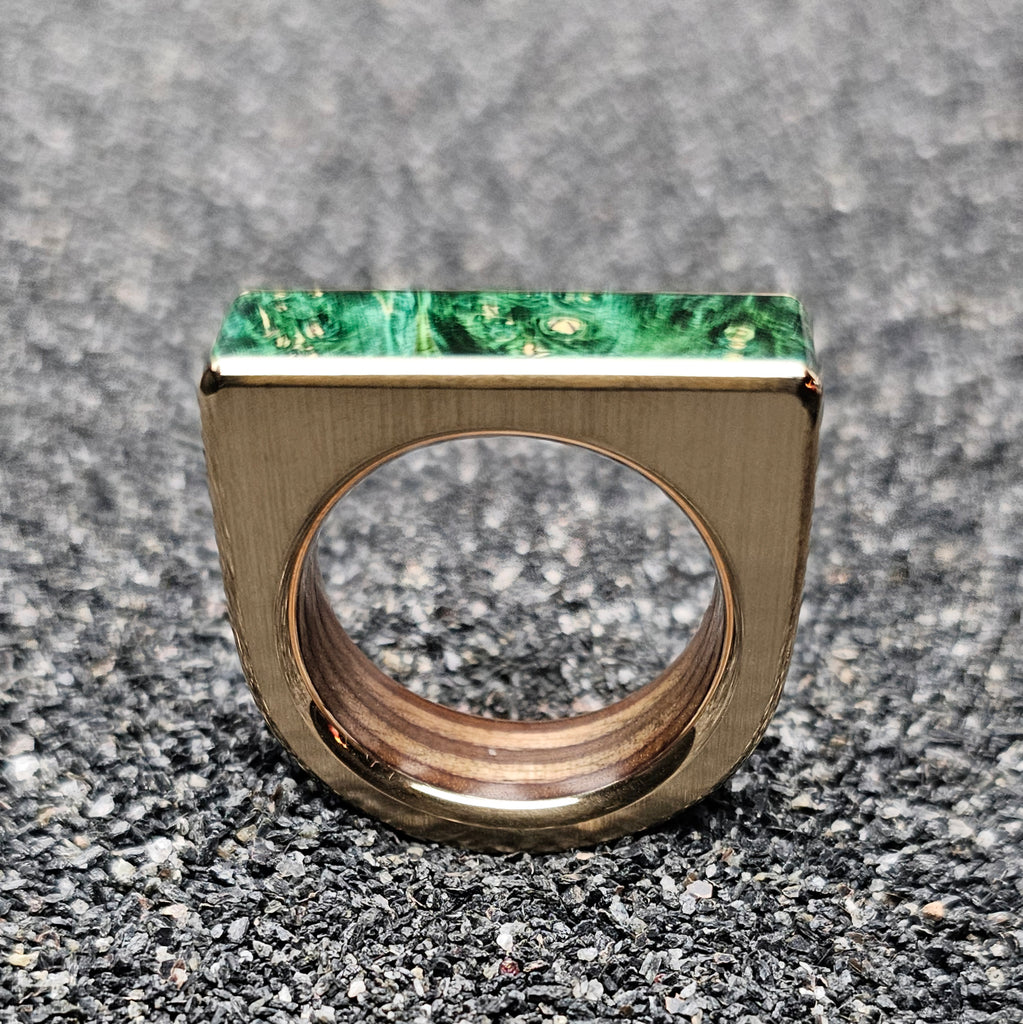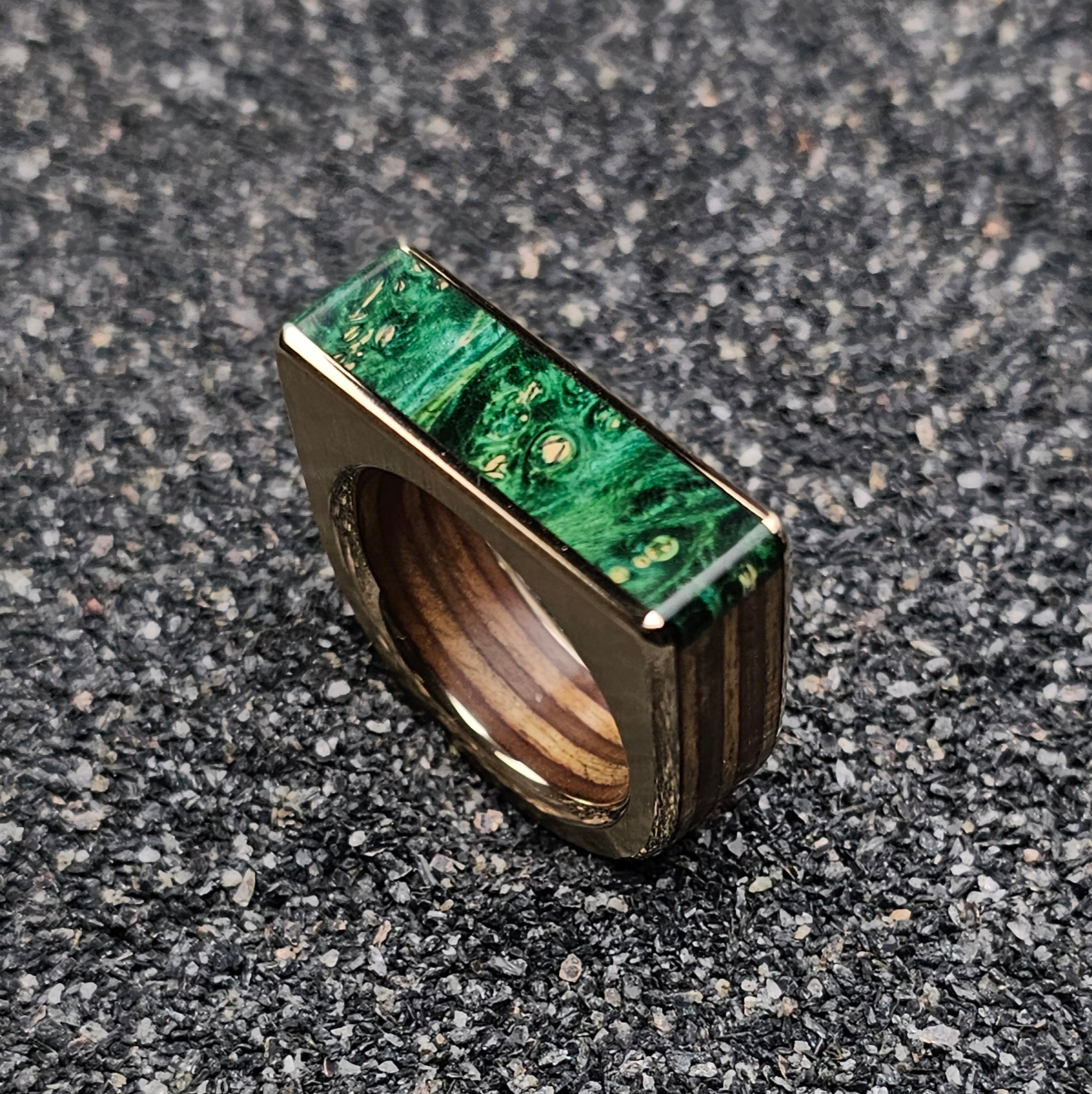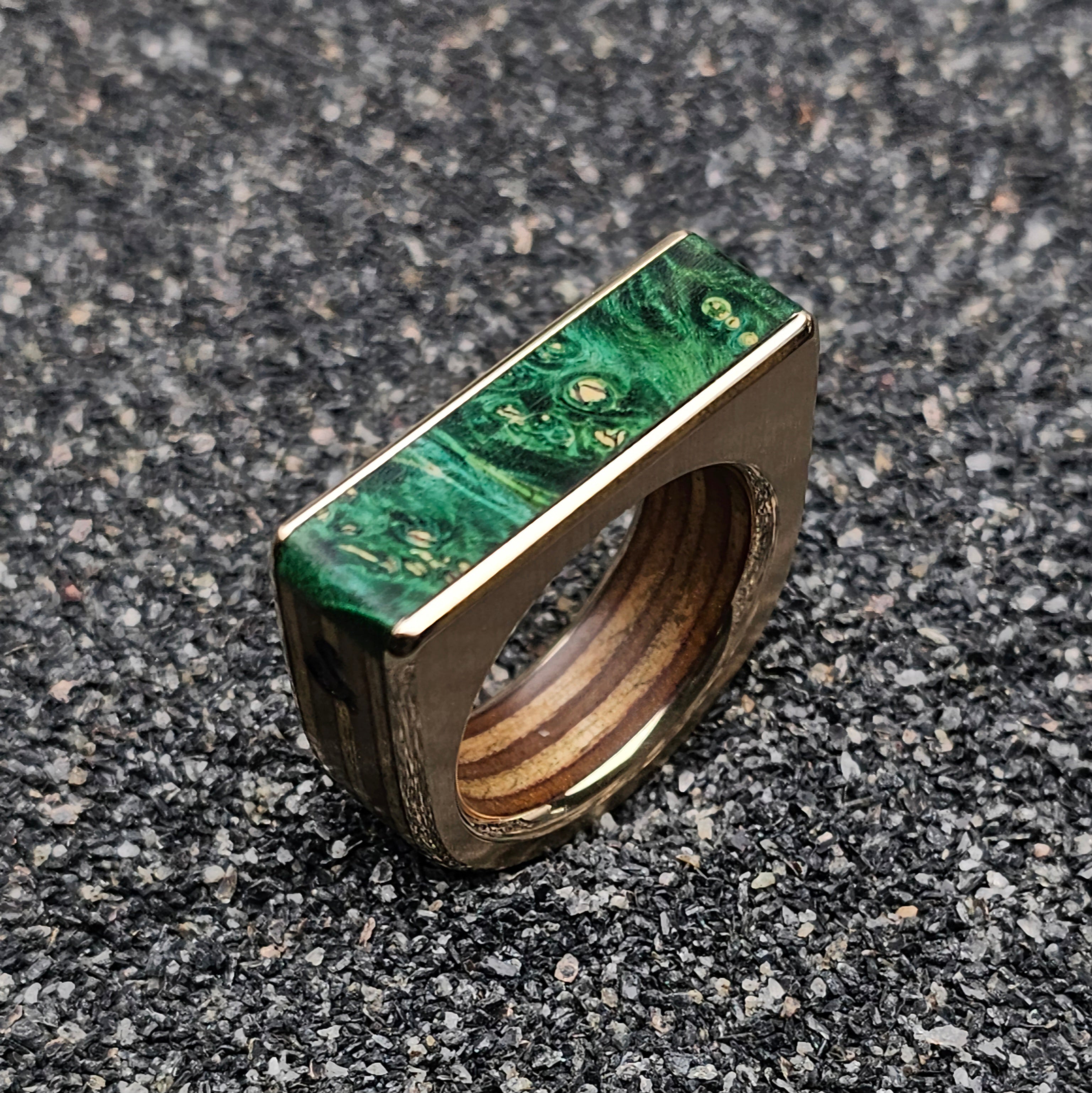 Discover the unparalleled craftsmanship of our green burl wood & brass with layered maple wood ring, adorned with continuum brass rivets. Handcrafted with meticulous attention to detail, each element harmoniously blends to create a timeless masterpiece, perfect for those with a discerning taste in unique jewelry.