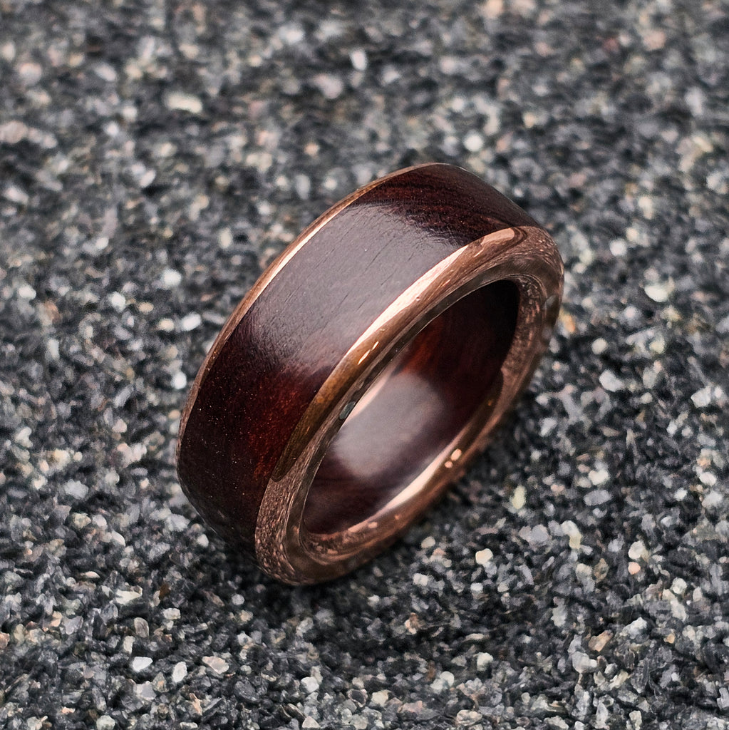 Material Info: Cocus wood band with copper sides & sterling silver rivets. This band style is heavier than our standard thickness. This original ring in size 8.5 is ready to wear and available to buy now. Each piece is a one of a kind sculptural piece of art. No two pieces are identical.