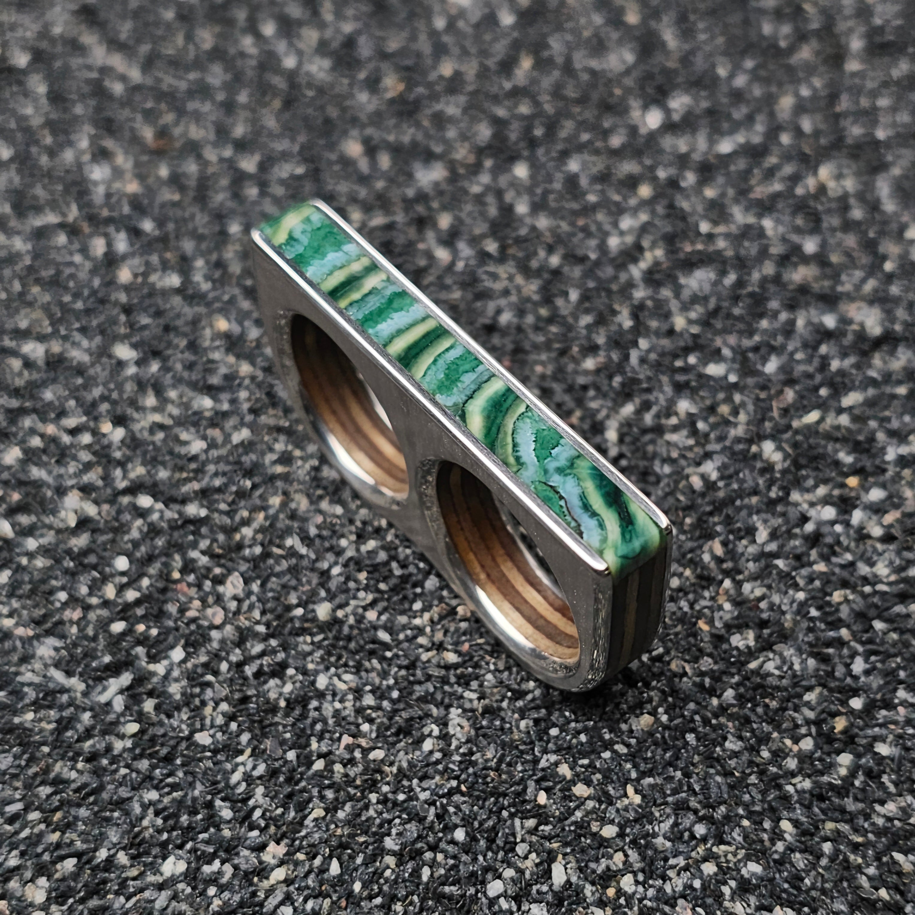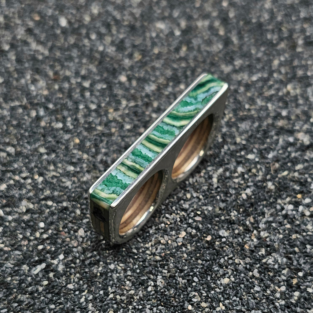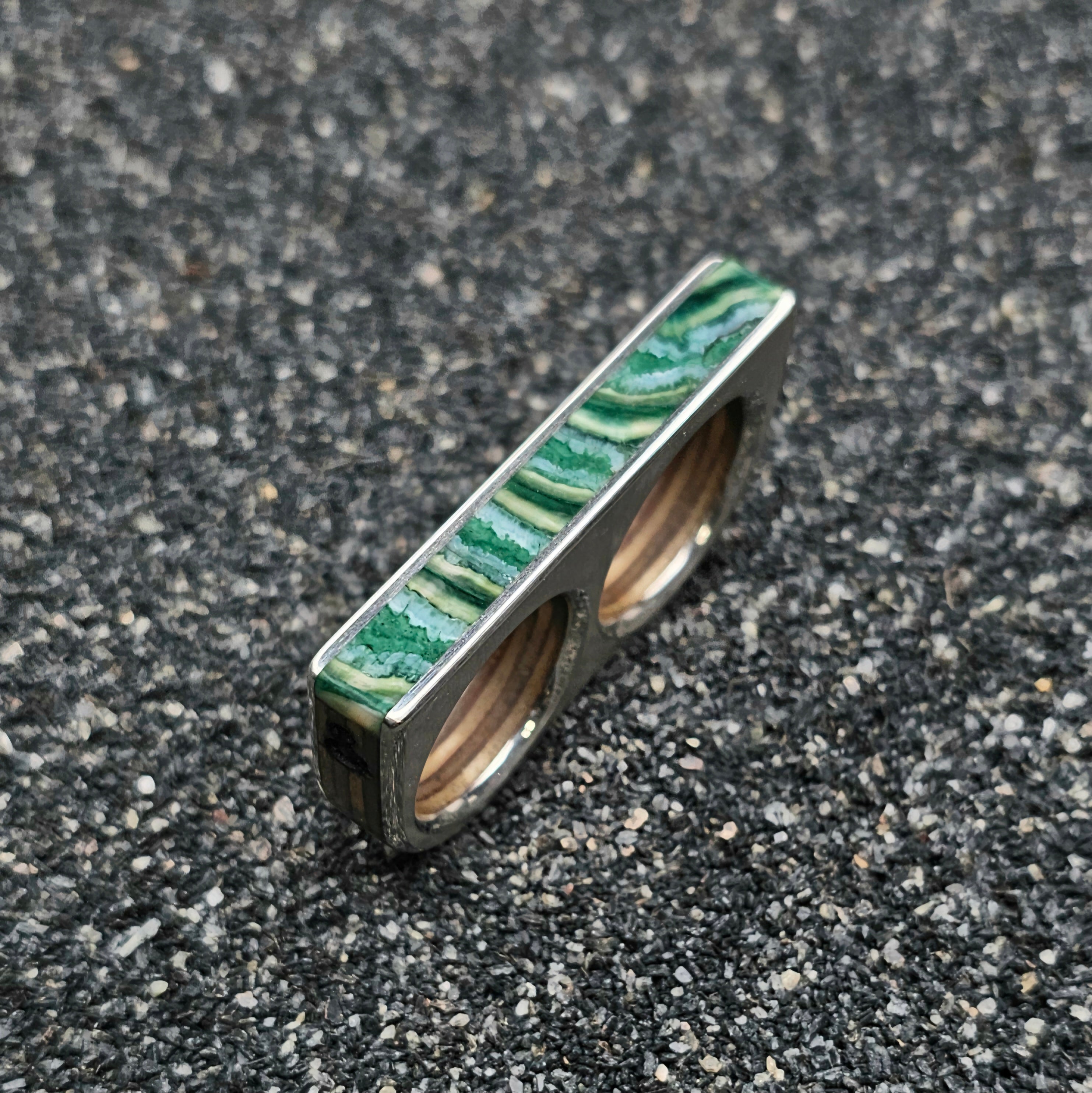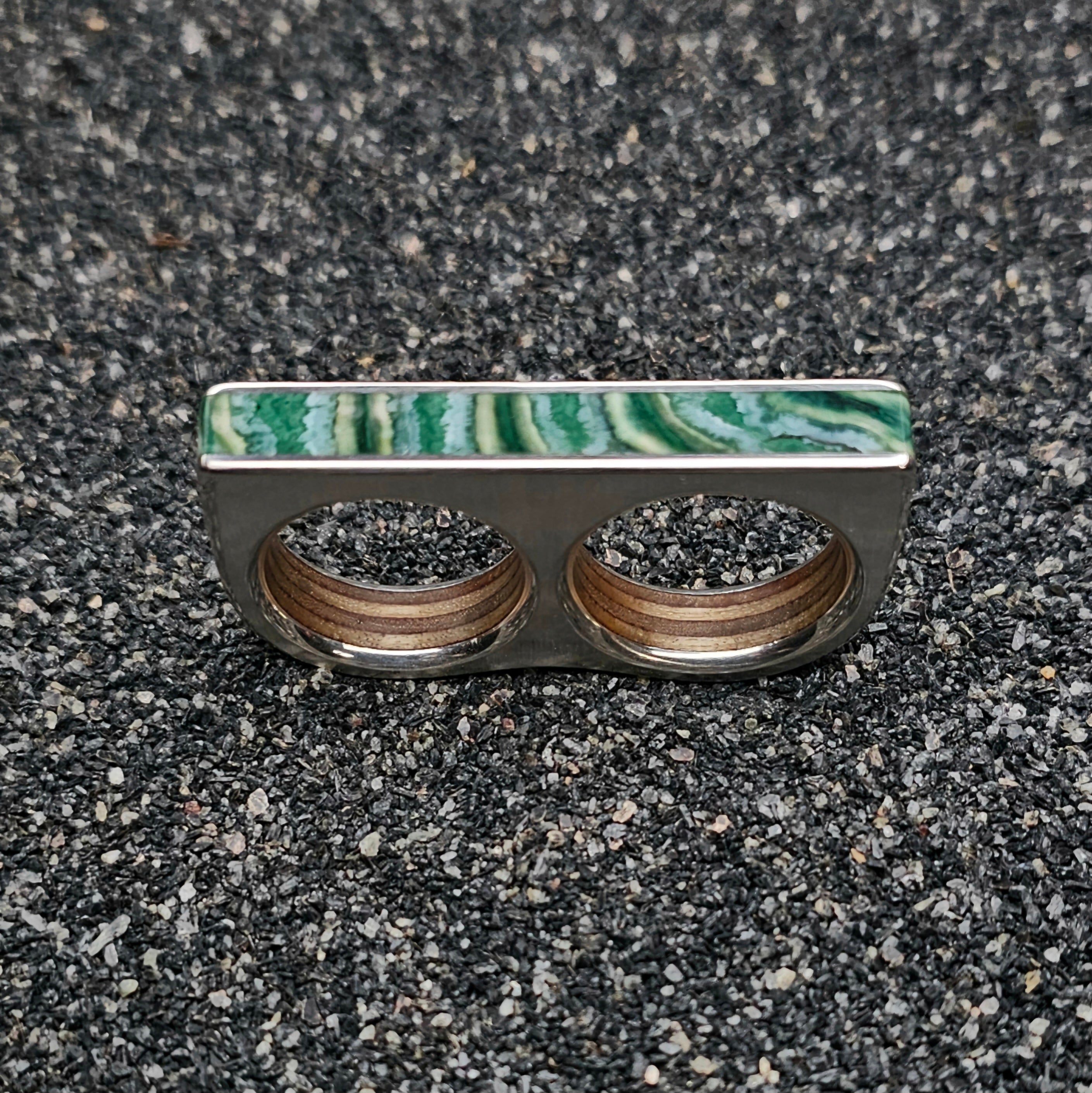 Discover exquisite craftsmanship with our teal green colored fossilized woolly mammoth tooth two-finger ring. Meticulously crafted, this unique piece combines layered maple faced wood with continuum silver sides, creating a stunning blend of ancient and contemporary materials. Perfect for those who appreciate distinctive, handcrafted jewelry that tells a story of natural history and modern artistry